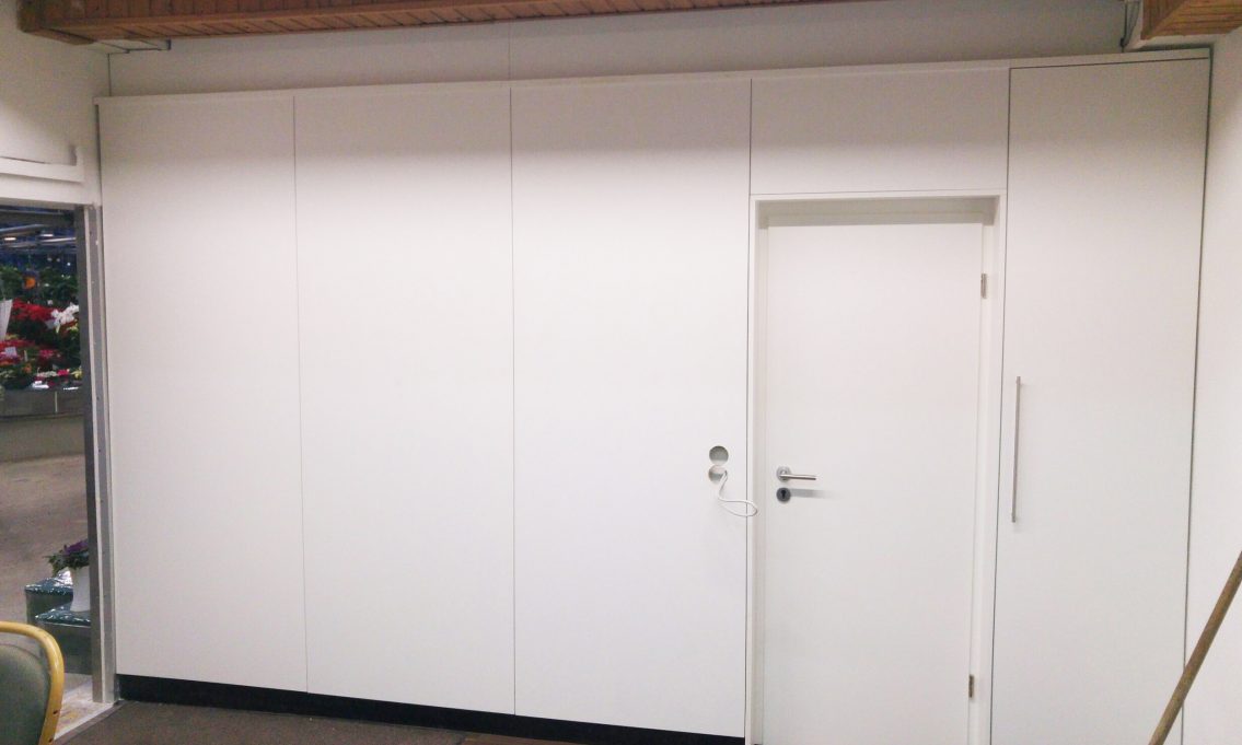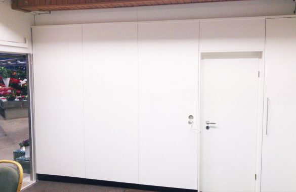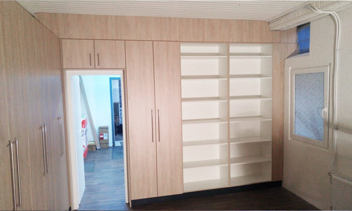 Hier wurde ein Arbeiszimmer aus einer Melaminharz beschichteten Platte in Naturholzpore angefertigt. Das Büro wurde so konzipiert, dass auf engstem Raum der größtmögliche Platz geschaffen wurde. Es beinhaltet diverse Schiebetür-Schränke, einen integrierbaren Schreibtisch, zwei Glasvitrinen, Rollcontainer und diverse Wandbords. Alle Schubaden sind mit Selbsteinzügen ausgestattet.